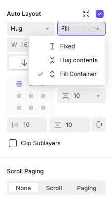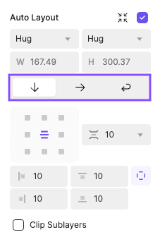 调整大小属性用于控制子图层及其父容器如何响应内容或布局变化进行调整。可在右侧面板的下拉菜单中分别对宽度和高度单独应用这些设置。将鼠标悬停在某个调整大小选项上时,会在画布中高亮显示其效果。