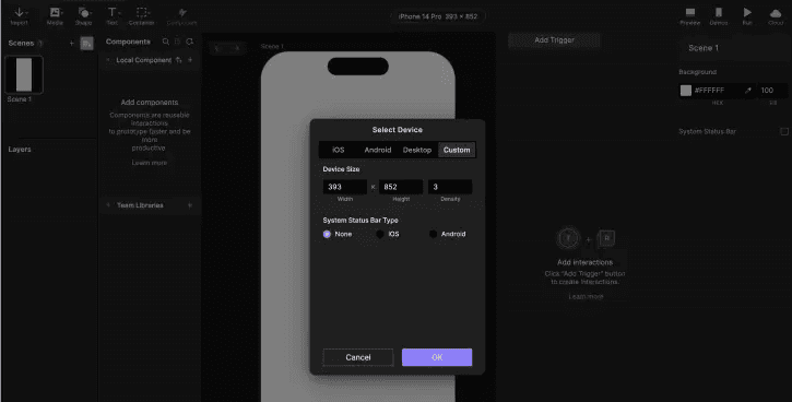 在 ProtoPie Studio 中为各种设备和设备边框创建原型。可从最常用的 iOS、iPadOS、Android 和桌面设备中选择。或者为所有其他屏幕类型设置自定义尺寸。