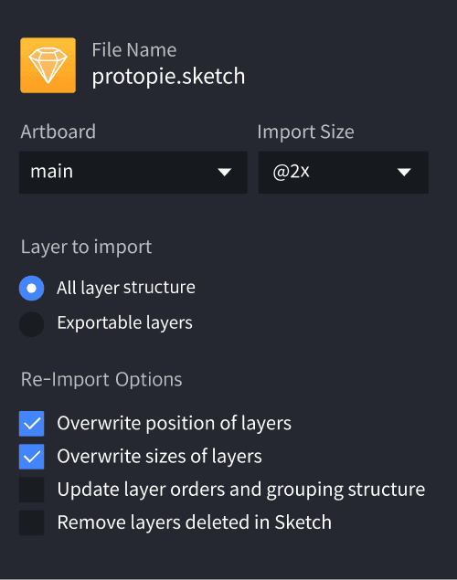 为获得最佳性能,在将设计导入 ProtoPie 时,请保持 Sketch 在桌面上打开且可见。