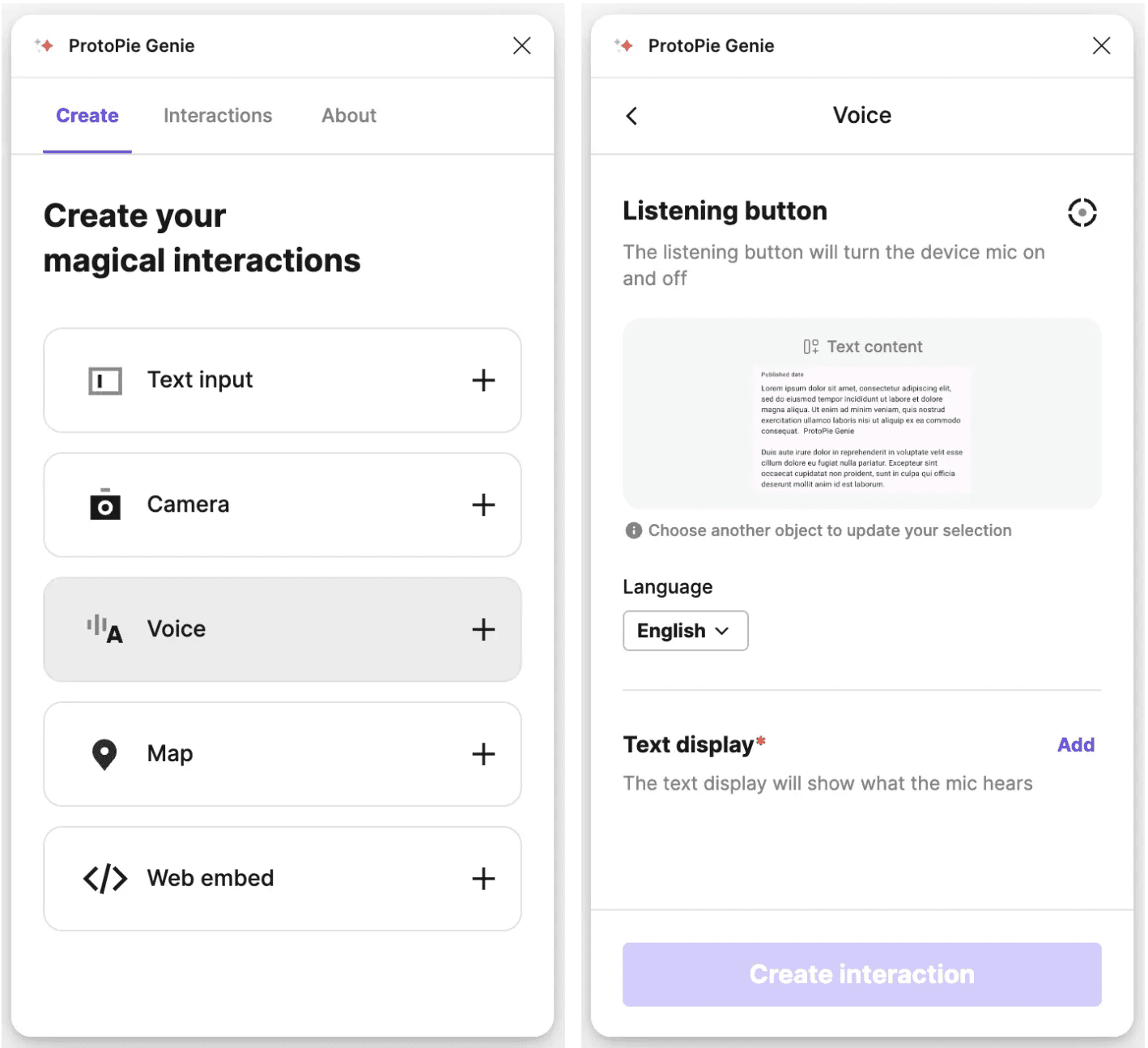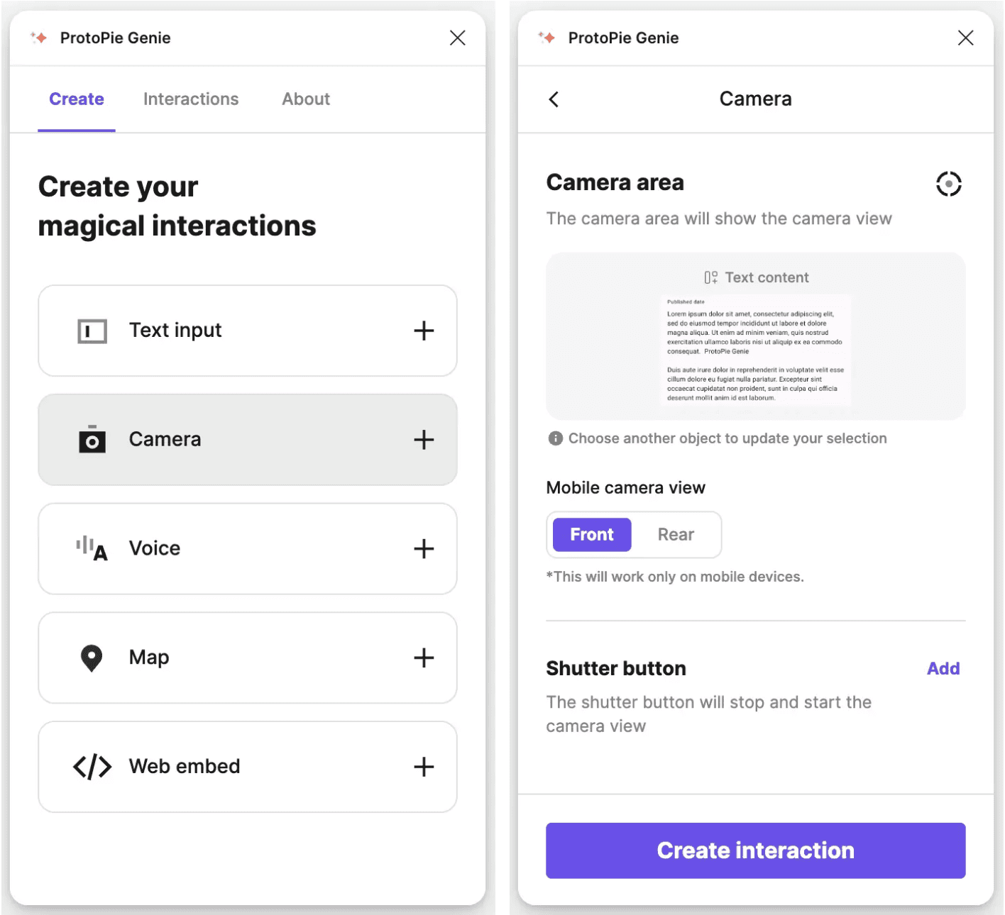 ProtoPie Genie 允许您在原型中加入多种交互元素,提升用户参与度: