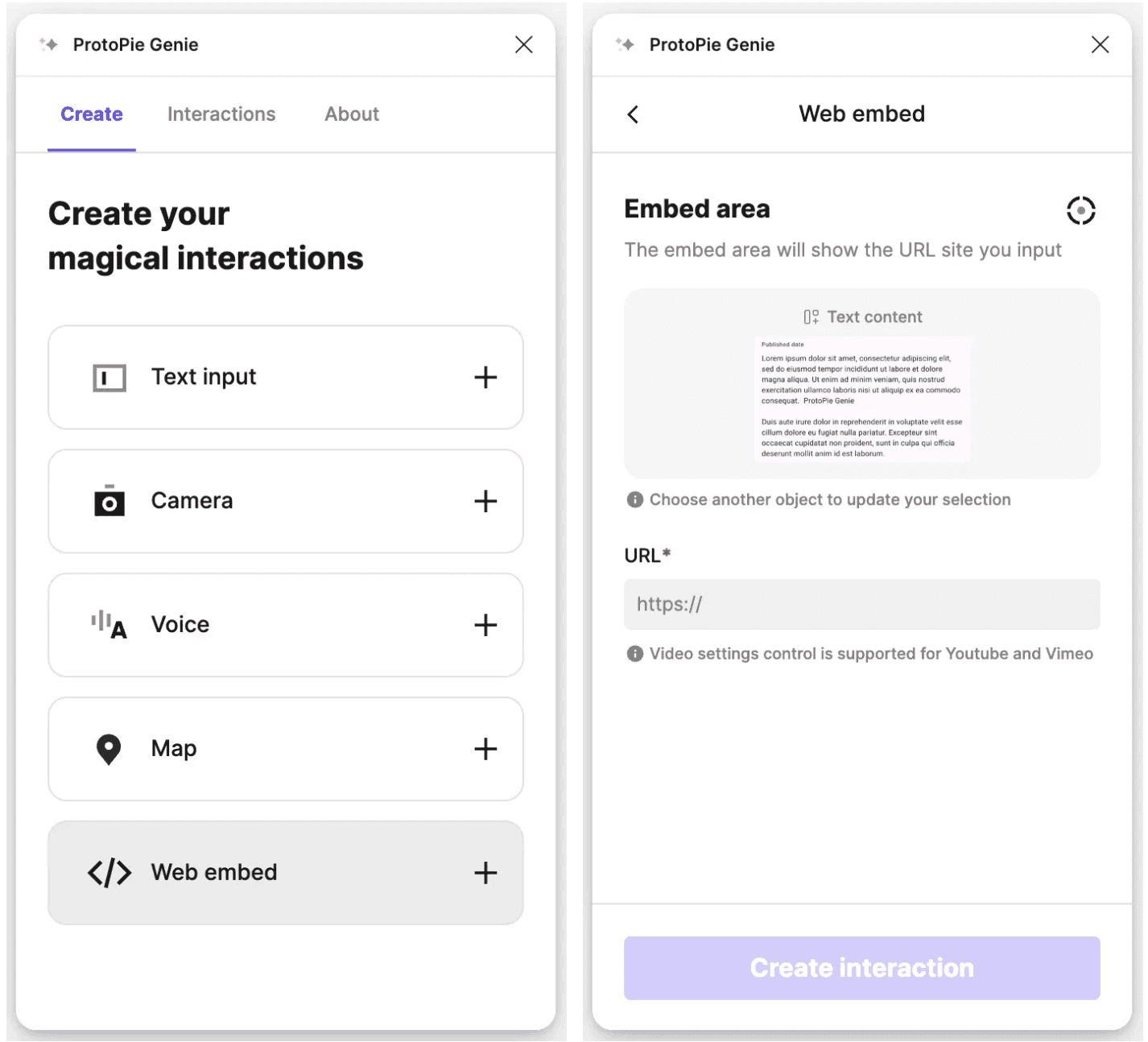https://开头的 URL。YouTube 和 Vimeo 链接将显示视频控制设置。点击 ‘Create interaction’ 添加网页嵌入。