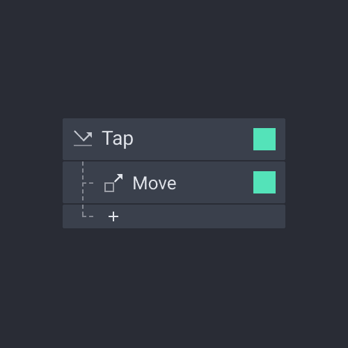 来看这个示例:当你点击绿色矩形后,它会向右移动。这是由一个交互实现的,该交互由 Tap 触发器和 Move 响应组成,并且都被分配到绿色矩形图层。