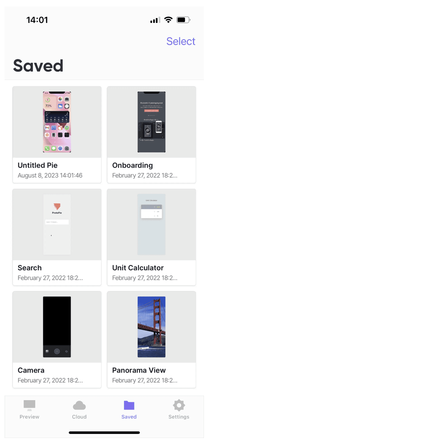 如果您希望使用 ProtoPie Player 离线测试原型,可以将原型保存在应用内。前往 ProtoPie Player 应用中的“Saved”部分即可访问本地保存的原型。了解更多关于如何将原型保存到本地的信息。