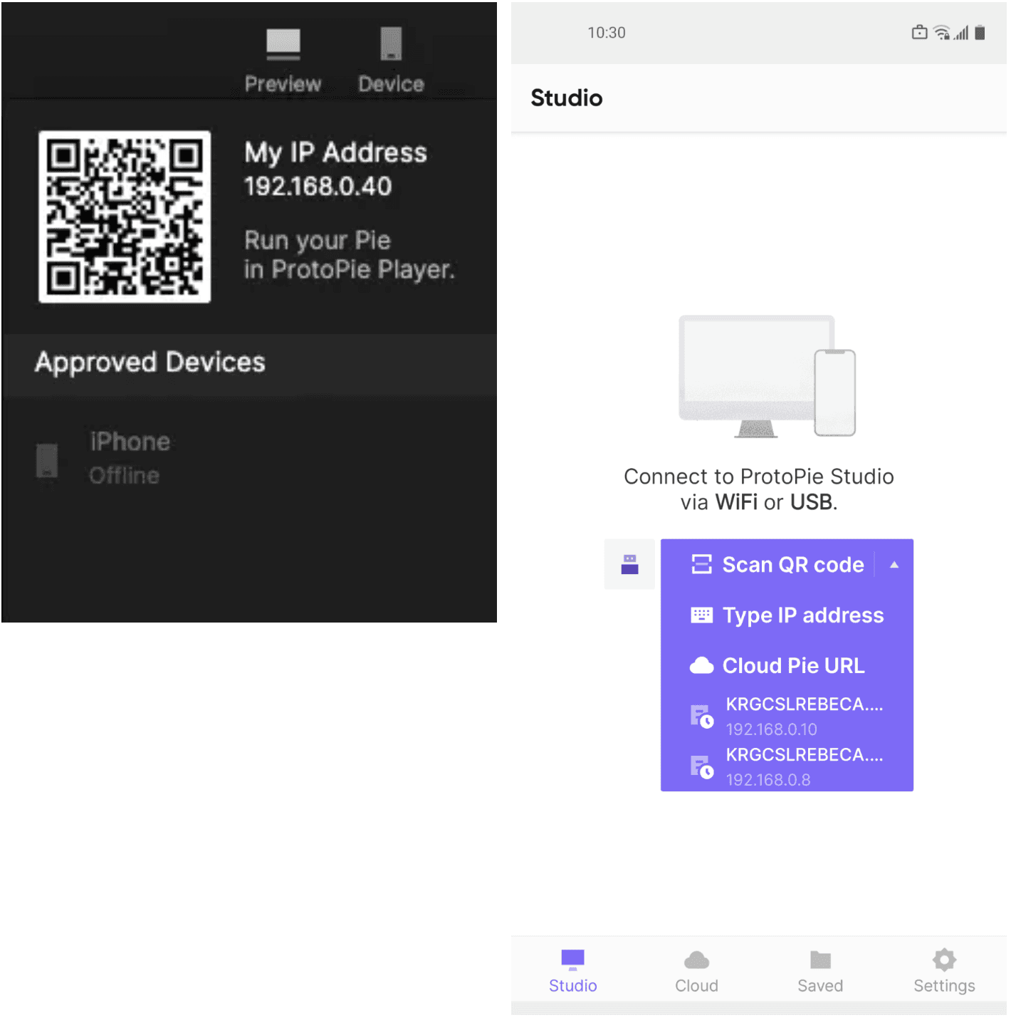 将 ProtoPie Player 连接到 ProtoPie Studio 有三种可用方法: