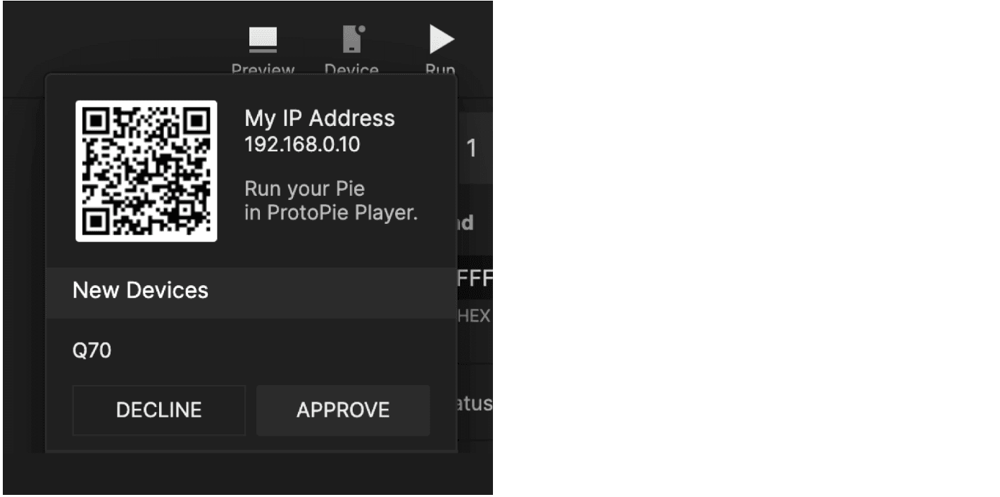 在 ProtoPie Studio 的工具栏中点击 Device 。将显示一个二维码。