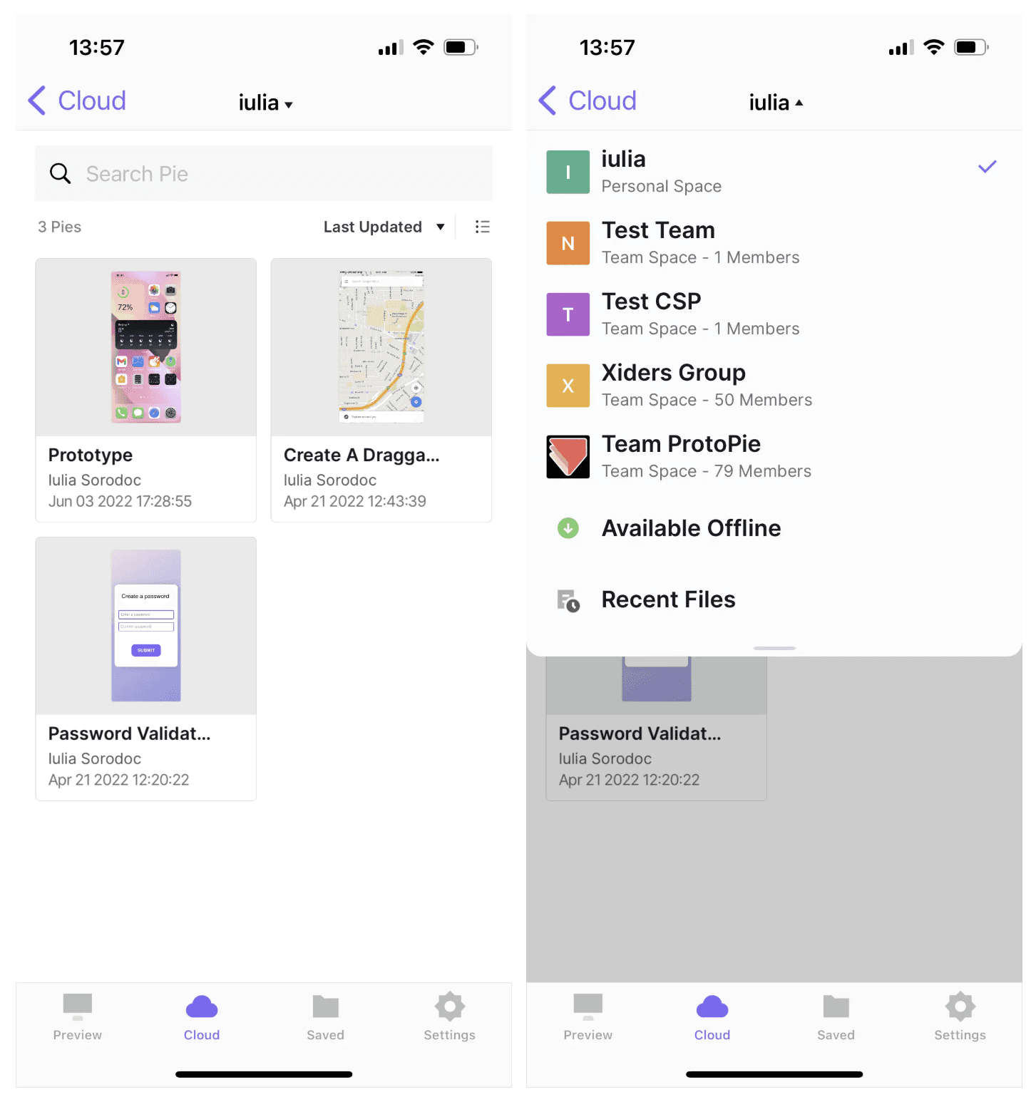 要查看保存在您云端中的所有 Pie(包括个人空间和团队空间中的内容),请在 ProtoPie Player 应用中打开“Cloud”部分。请确保您已登录,以访问这些 Pie。