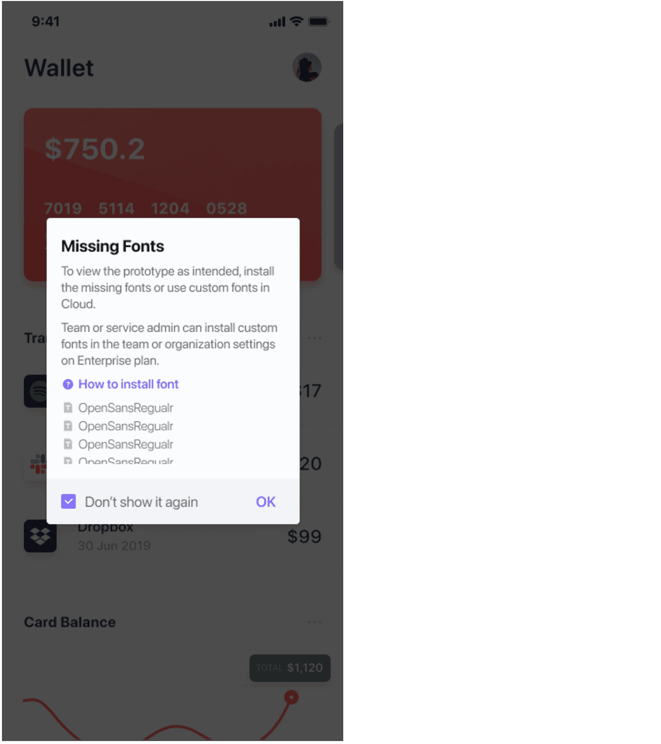 如果您在本地打开包含自定义字体的原型(无论是在 ProtoPie Studio 中还是通过 ProtoPie Connect),可能会遇到字体缺失提醒。