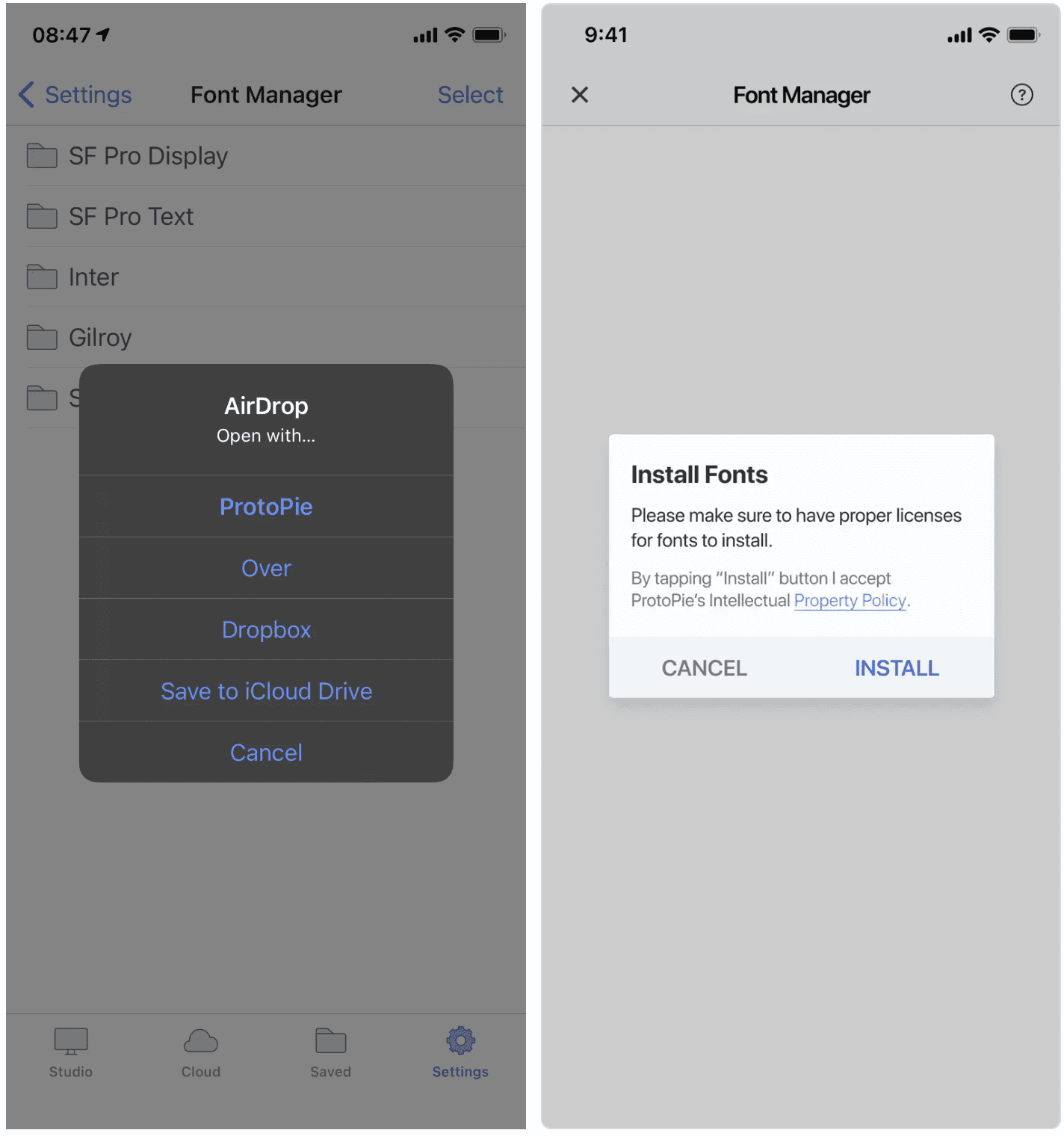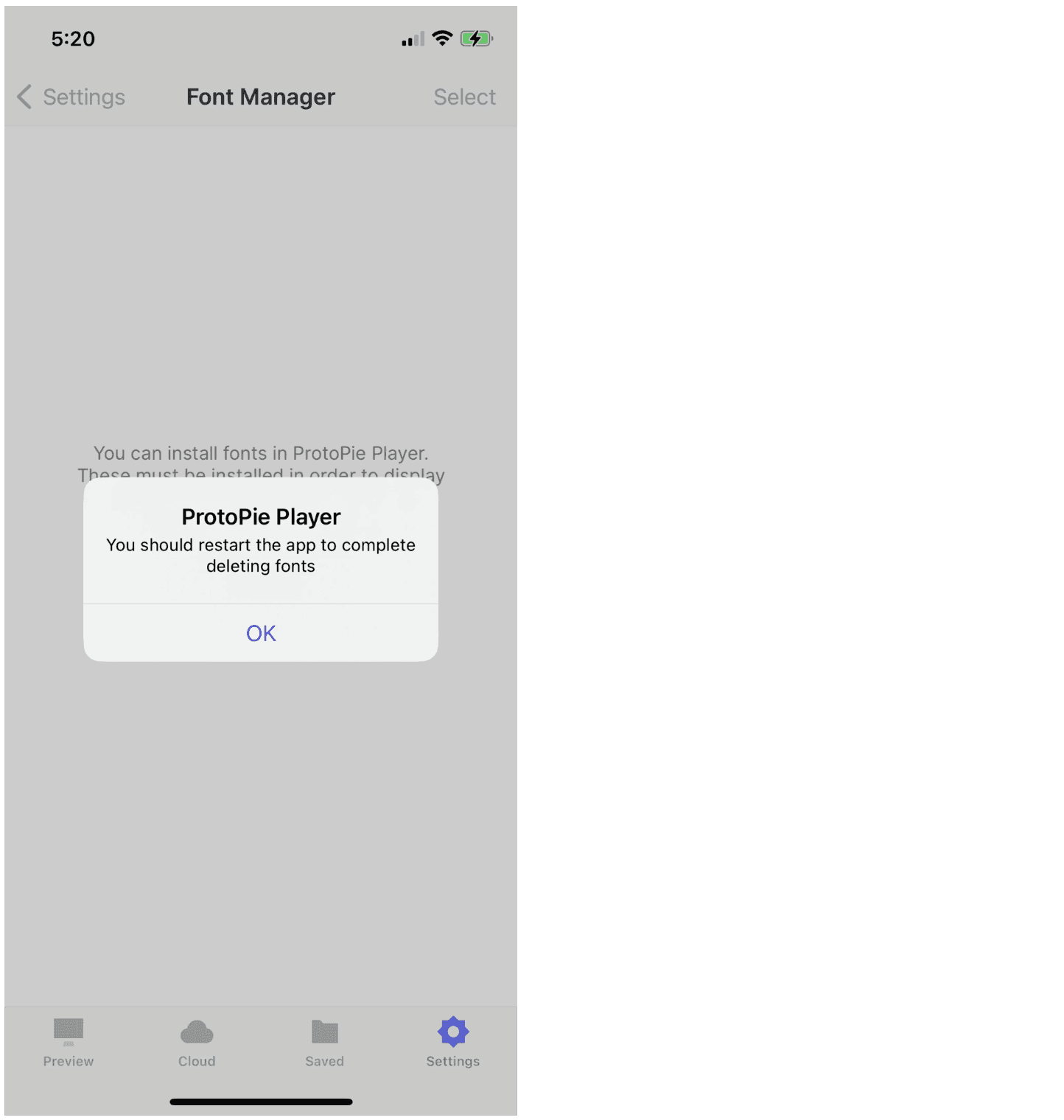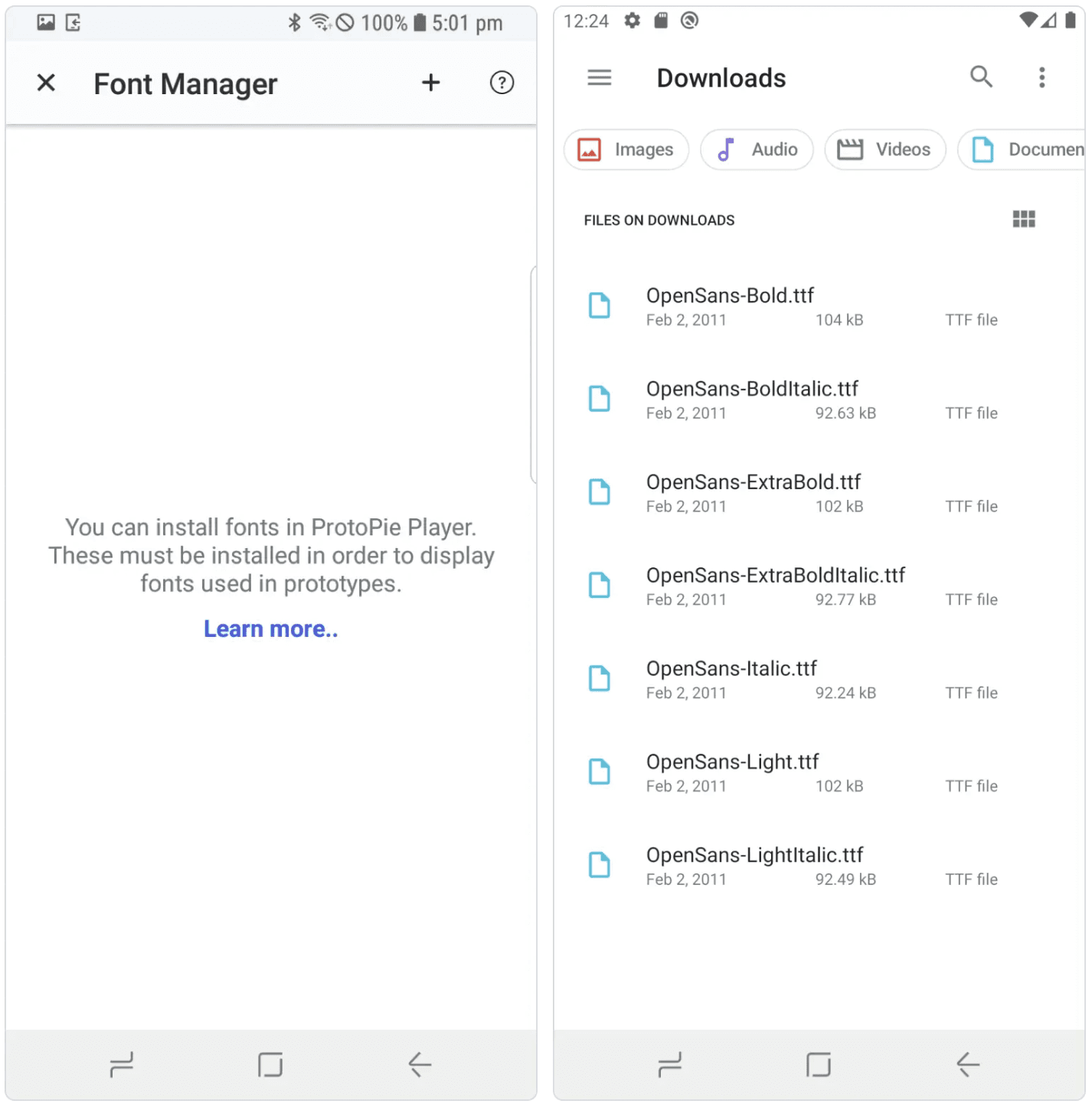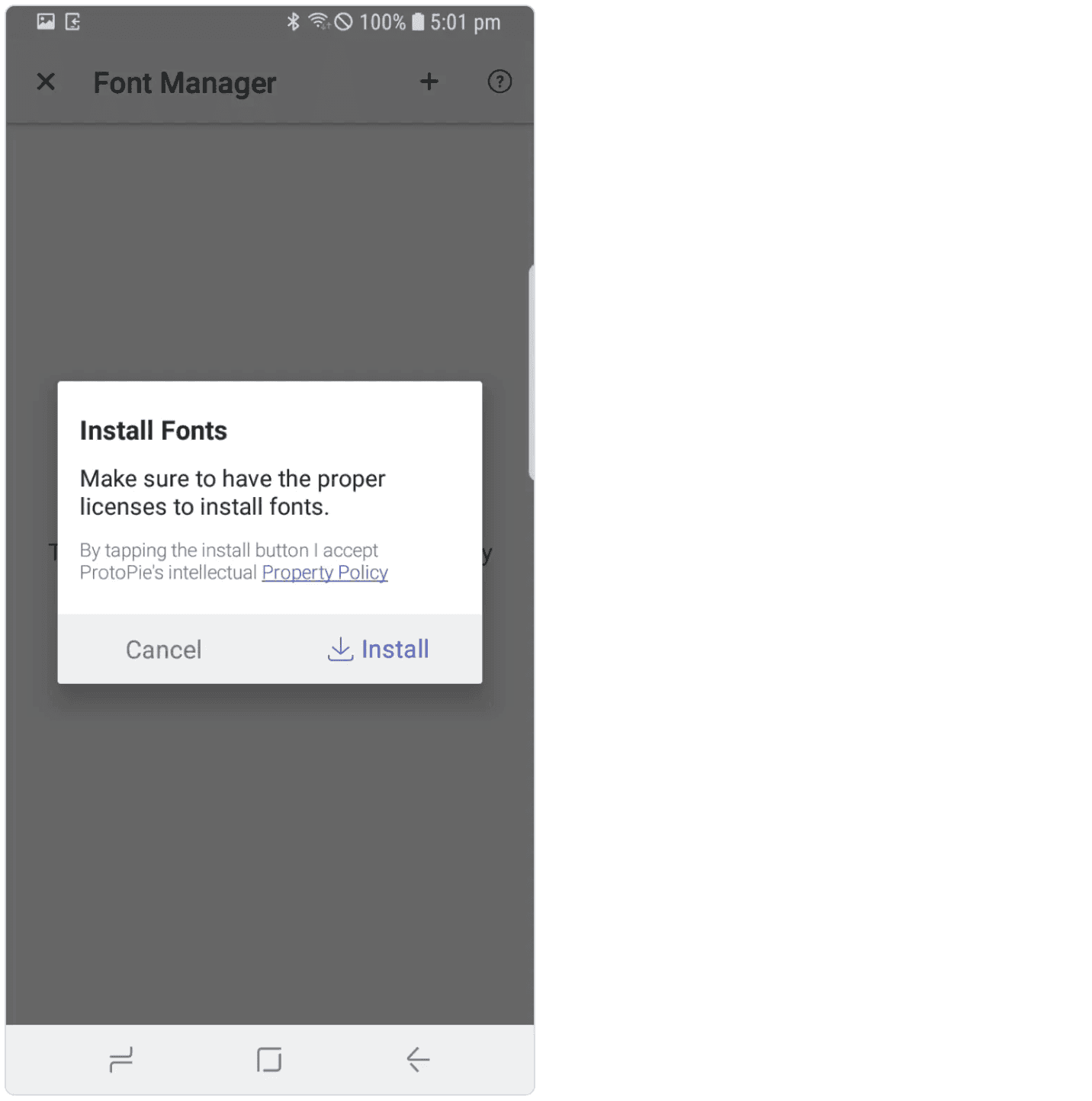 为确保在 ProtoPie Player 中使用非系统字体时,文本和输入图层能够正确显示,您必须在移动设备或平板电脑上单独安装这些字体。安装完成后,这些字体将显示在 ProtoPie Player 的字体管理器中,可在设置中找到。