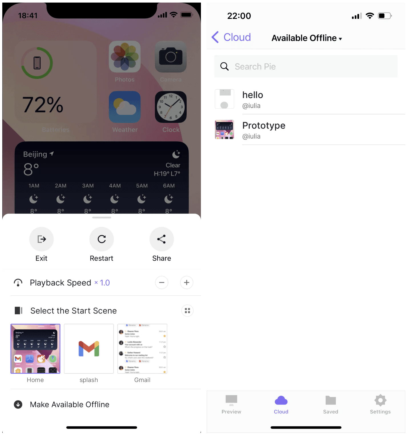之后,该原型将在 Cloud 的“离线可用”部分中可访问。如果你当前未登录 ProtoPie Cloud,可以在屏幕右上角的选项菜单中找到此选项。