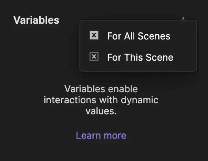 用于所有场景的变量可在原型中的每个场景中访问。它非常适合在场景之间传递数据。例如,如果你在场景 A 中修改了一个用于所有场景的变量值,那么该变化会影响整个原型中所有使用该变量的地方。